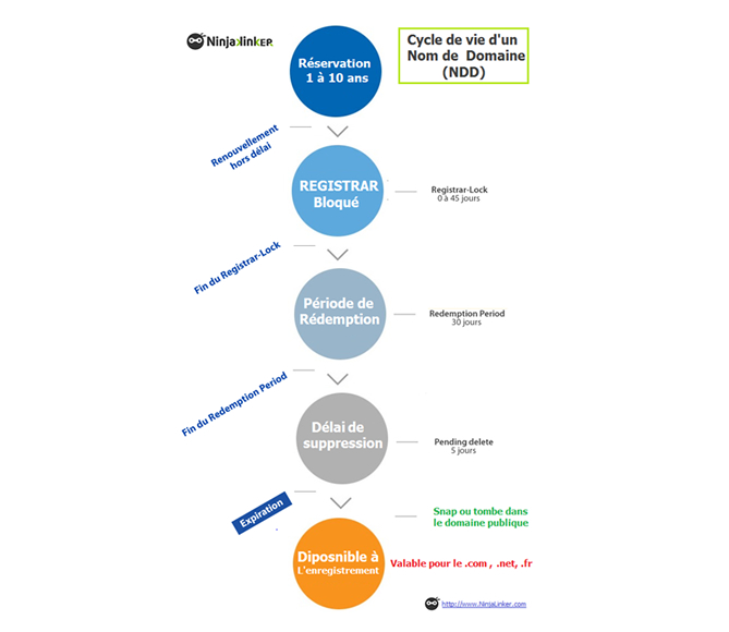 Un petit rappel qui peut servir, voici un schéma représentant brièvement le cycle de vie d’un NDD et notamment les étapes clés avant son expiration. Plutôt utile lorsque l’on a jeté son dévolu sur un nom de domaine précis soit pour une stratégie de marque soit pour sa stratégie de SEO Link-buiding